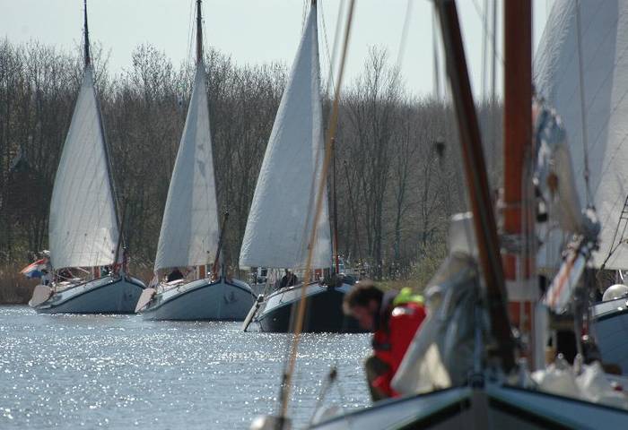 Deze keer vertrekken we onder een blauwe hemel als eerste en nadat alle schepen de zeilen gezet hebben bied dit ons een aanblik van 14 prachtige Platbodemschepen onder voltuig. Dit beeld is prachtig en onze camera’s klikken als ware het een wedstrijd.