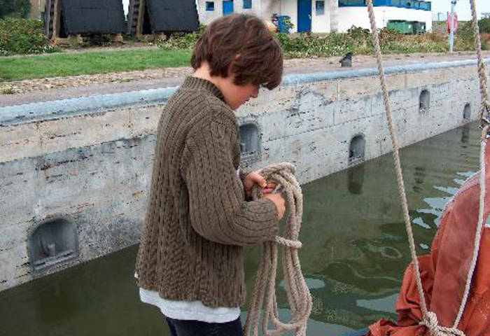 Ach, wat is Friesland toch een lief kleinschalig waterlandje vergeleken bij het wad. We moeten via het Heeger Meer naar Workum, bij welks doorvaart we driemaal een klompje voor 60 eurocent voor de stadsbruggen en eenmaal een sluis voor 3 euro krijgen aangeboden. Die 3 euro komt de sluismeester eigenbenig halen. Wat een ontroerend stukje antiek toch die klompjes en wat goed zijn die drie bruggen plus sluis niet voor de werkgelegenheid van dit pracht-stadje. En hoe nuttig is zo’n doorvaart niet om het onbekende schip beter te leren kennen! En ze draaien uiterst zorgzaam, daar in Workum. Wachten op groen en scheeftrekken is er nauwelijk bij. Na een eerste nacht in de wilde haven van Kornwerderzand-binnen, waarbij Kasper gretig oefent in mastworpen en klampbeleggen, varen we de volgende dag rond een uur of een ‘s middags de sluis uit, de Dove Balg en de Texelstroom tegemoet. De pech deze week is dat de daghoogwaters alle rond het middaguur vallen. Om stroom mee te hebben betekent dat of pas om een uur ‘s middags of al om een uur of zeven ‘s morgens varen, al naar gelang vertrekpunt en reisdoel. Aan het middernachthoogwater heb je, ongeacht de stroom, op onbevuurde routes toch niets.